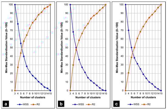 Trends in the standardised (min–max) within-cluster sum of squares (WSS) and the average contributions of the variables to clustering (R2 coefficient) for 3 to 15 clusters over the (a) pre-Soviet, (b) Soviet, and (c) post-Soviet periods.