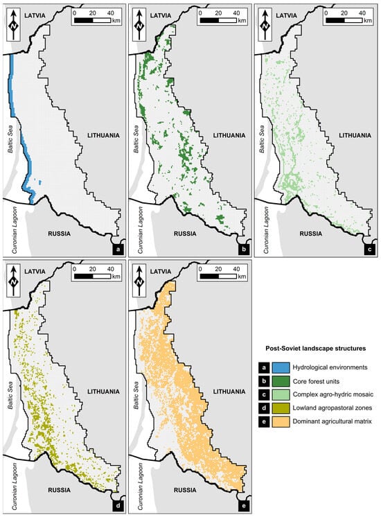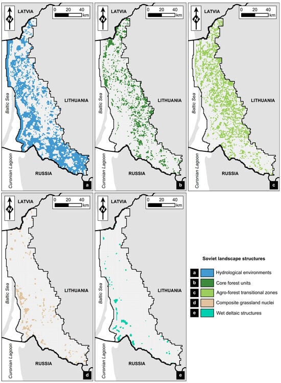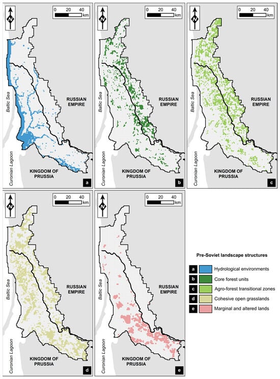 Spatial distribution of the pre-Soviet landscape structures with (a) hydrological environments, (b) core forest units, (c) agro-forest transitional zones, (d) cohesive open grasslands, and (e) marginal and altered lands.