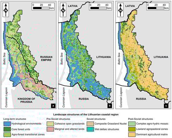 The use of landscape metrics has become widespread since the emergence of landscape ecology in the 1980s, which focused on the relations between spatial structure, ecological functions, and landscape dynamics []. However, they are not exclusive and can be complemented or contrasted by alternative methodologies. In coastal contexts, for instance, the quantification of shoreline change is often conducted through statistical analysis of remote sensing, mapped, or measured data. Although effective, these techniques typically have a limited spatial scope, focusing primarily on the immediate coastline [,]. More broadly, landscape characterisation can be achieved using remote sensing techniques, including automated or supervised classification of land use and land cover changes: in Lithuania, such methods are widely applied due to the standardisation of satellite data in both acquisition and image processing. These studies have significantly contributed to understanding spatial dynamics related to major socio-political transitions, particularly the shift from the Soviet to the post-Soviet period. The focus is often on changes in forestry and agriculture, two sectors most affected by this transformation [,,,,,,,,,,,]. Additionally, multi-criteria analysis provides an integrative framework for evaluating landscape evolution by incorporating social, environmental, and economic dimensions through a set of defined indicators []. Finally, participatory methods, based on interviews, surveys, and mental mapping, allow for the exploration of social representations of landscapes and their cultural and identity-based values [,].