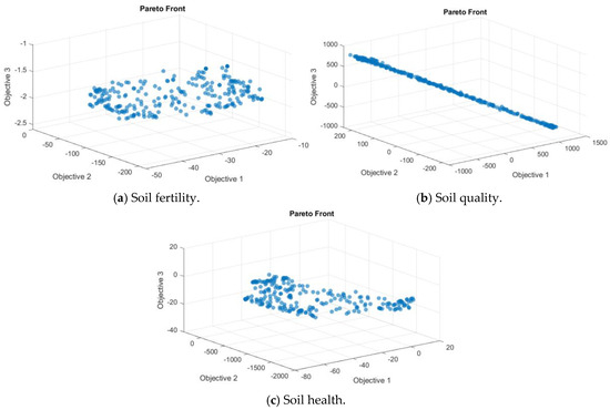 MATLAB® R2023b (23.2.0.2365128) 64-bit (Win 64), in trial version [43], was used as the programming and numerical calculation platform for developing MOGA models to evaluate soil fertility, health, and quality. The NSGA-II (Non-dominated Sorting Genetic Algorithm II) was used as a MOGA due to its high efficiency in identifying solutions with multiple competitive objectives—for each MOGA (fertility, health, and quality), three objective functions were defined—along with their ability to find optimal Pareto solutions. The genetic operators used in the algorithms are presented in Table 1.
