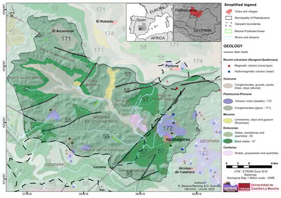 According to García [], the municipality is characterised by the presence of several morphostructural units. There are morphostructures corresponding to the oldest Ordovician bedrock (quartzites, sandstones, and slates), and they are folded and fractured, with an Appalachian relief, such as the Solanazo-Valronquillo massif, the Porzuna-Fernán Caballero mountains, and the Piedrabuena-Alcolea mountain range. There is also the Piedrabuena basin, a synclinal depression filled with more recent Pliocene–Pleistocene and Quaternary materials (limestones, marls, and alluvium).