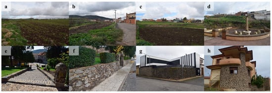 Agronomic and urban uses of volcanic rock in Piedrabuena: (a) Negrizal (blackish soil) on La Arzollosa St.; (b) Negrizal (blackish soil) on Juan de Austria St.; (c) Negrizal (blackish soil) on El Cerro St.; (d) Volcanic gravel on Cruz St.; (e) Pavement on De los Toreros St.; (f) Masonry on De los Toreros St.; (g) Modern house on Ruperto Villaverde St.; (h) Modern house on De los Toreros St.