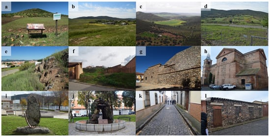 Geotourism resources associated with the volcanic geoheritage of Piedrabuena: (a) Piedrabuena Volcano Natural Monument; (b) La Chaparra volcano; (c) Lucianego maar; (d) volcanic outcrop of Sierra de la Cruz; (e) lava flows of Sancho Panza St.; (f) lava flows of de la Cruz St.; (g) Mortara Castle; (h) Nuestra Señora de La Asunción Church; (i) monolithic sculpture in Tabla de la Yedra Park; (j) fountain of Los Jardincillos square; (k) cobblestones and pavements; (l) low walls and adobe walls.
