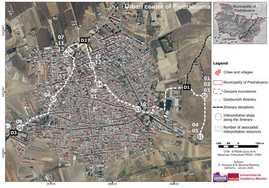 Based on the results obtained for the urban centre of Piedrabuena and the need to enhance volcanic geotourism in the newly declared UNESCO Global Geopark Volcanes de Calatrava, Ciudad Real, it is necessary to create a volcanic–touristic experience linked to the volcano through an urban geotourism itinerary, which is the final part of the results and the goal of this work. This itinerary has a geographical theme with a primarily touristic orientation, but it is also educational and informative and takes place within the Piedrabuena urban area (Figure 5). It connects all the identified and valued resources, considering their geomorphological heritage evaluation, proximity to the urban area, and current conservation status.