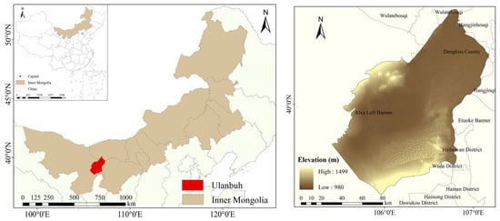 The Ulanbuh Desert is located in the northwest region of Inner Mongolia Autonomous Region in northern China, extending across the Alshan League and Bayan Nur of Inner Mongolia (39°17′–40°46′ N, 105°24′–107°01′ E), with an area of about 1.3 × 106 hm2 (Figure 1). The terrain of the area is marked by a low middle and high surroundings, with elevations ranging from 980–1499 m. The region is predominantly defined by a temperate arid climate with low precipitation (110–160 mm) and high evapotranspiration (2380 mm). The Yellow River serves as the principal water source for the region. And its mean annual temperature is 8.6 °C with a large diurnal temperature difference [37]. The natural vegetation is dominated by hyper-arid and arid types of desert vegetation and halophytic vegetation [38].