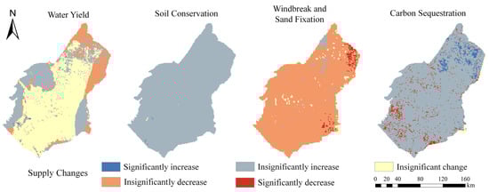 From 1985 to 2020, there were obvious spatial distributional differences in Wy supply variability within the study area (Figure 2). Specifically, the central region exhibited mainly insignificantly changed in Wy supply, the northeastern part was insignificantly decreased, and the eastern and western parts were insignificantly increased. There were not distinct spatial differences in the overall changes in Sc, Ws, and Cs supply. The Sc and Cs exhibited an overall insignificant increasing trend, and Ws showed an overall insignificantly decrease.