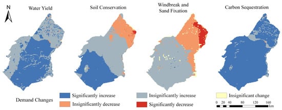 From 1985 to 2020, there have been notable spatial distribution differences in the changes in demand for both Sc and Ws, whereas the changes in demand for Wy and Cs have exhibited no significant spatial distribution variations (Figure 3). Specifically, Sc and Ws demonstrated a decreasing trend in the northeastern part of the study area, accompanied by an increasing trend in the central and southwestern areas. Both Wy and Cs showed an overall upward trend.