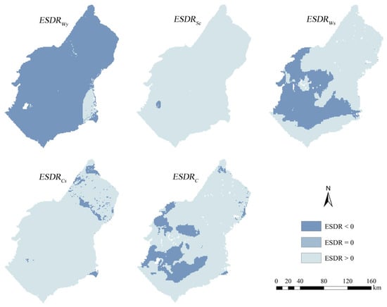 All ESDR exhibited similar spatial distributions, consistently demonstrating a spatial mismatch between supply and demand from 1985 to 2020 (Figure A1). Therefore, only the spatial distribution for 2020 is presented (Figure 4). Overall, ESDRSc, ESDRWs, ESDRCs, and ESDRC displayed a surplus status. However, it observed localized deficits in the southwestern region for ESDRSc, ESDRWs, and ESDRC, as well as in the northeastern region for ESDRCs. ESDRWy exhibited an overall deficit status, while a notable surplus was identified in the eastern Yellow River coastal area.