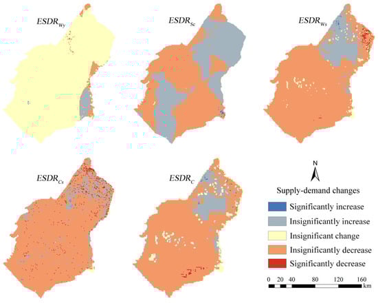 The overall trend from 1985 to 2020 showed an insignificant change in ESDRWy and decreasing trends in ESDRSc, ESDRWs, ESDRCs, and ESDRC. However, there was spatial differentiation in the supply–demand ratio for each service. Specifically, there was an insignificant upward trend of ESDRC in the northeastern region, while the remaining regions showed an insignificant downward trend (Figure 5). The ESDRWs followed the same trend as ESDRC. However, the ESDRWy showed insignificant change in its spatial distribution, the ESDRCs demonstrated an insignificant downward trend. The ESDRSc increases slightly in the northeastern and southern regions, and decreases slightly in other areas.