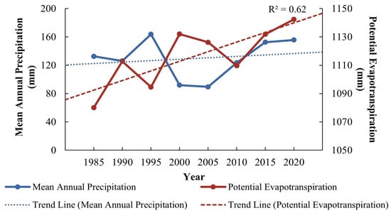 Mean annual precipitation and potential evapotranspiration and their trends in the Ulanbuh Desert from 1985 to 2020.