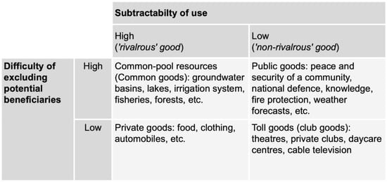 In this matrix, goods are divided by the degree of difficulty of exclusion of potential beneficiaries (high or low) and by the degree of subtractability of use (high or low). In the low subtractability—high beneficiary exclusion difficulty quadrant, we have the “nonrivalrous” goods, also known as public goods, which can thus be enjoyed simultaneously by an unlimited number of consumers. In the opposite position, we find high subtractability—low exclusion difficulty where private goods are placed. The lower left cell, which indicates low substitutability and low exclusion difficulty, houses club goods [22] or pay goods, resources that lie somewhere between public and private goods and reveal different willingness to pay depending on the availability of the user who uses that type of good. Finally, there remain the commons, referred to here as subtractable goods with a low degree of excludability, such as natural resources.