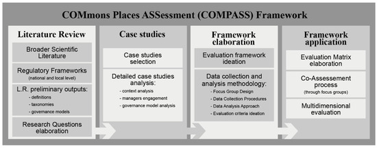 The paper is structured according to the following framework: Section 2 presents the aforementioned literature review; Section 3 exhibits the methodological framework, describing the main phases and tools for the elaboration of the COMmons Places ASSessment (COMPASS) approach; Section 4 illustrates the five Case Study selection and deepens their analysis; Section 5 discusses the results regarding the implementation of COMPASS in the selected case studies, and analyses the potential and critical issues of this approach; Section 6 is dedicated to the conclusion and future perspectives of research.