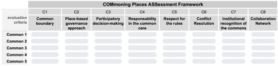 The criteria employed—derived from Ostrom’s principles as reinterpreted by Wall [25]—served as a foundation for constructing the initial evaluation matrix, which may be further expanded or adapted in the future. However, it is essential to acknowledge that any evaluation or decision-making process must remain context-sensitive. While the methodology can inform different stages of assessment, each case requires a tailored approach, based on the specificity of the decision-making problem, the governance structure involved, and the characteristics of the community and space.