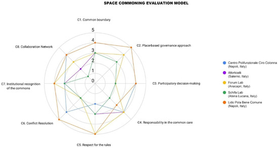 The results obtained, summarised using the Likert scale, were visualised in a radar chart (Figure 5) [42] with the aim of more clearly identifying the strengths and weaknesses of the governance of each commons, on the one hand, and, on the other, of visualising, through comparison, the convergences and divergences among the different governance models adopted by the case studies.