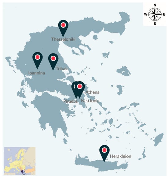 In Greece, homelessness persists as a significant social and public health concern, particularly in urban centers such as Athens, Thessaloniki, Piraeus, Herakleion (Crete Island), Ioannina, Trikala, and Nea Ionia (suburb of Athens), where the majority of the country’s homeless population is concentrated. According to a nationwide survey conducted in May 2018 under the auspices of the Ministry of Labor, Social Security, and Social Solidarity, the total number of homeless individuals was recorded at 1645, with 691 living on the streets and 954 residing in temporary housing structures or supported apartments [11,12,13]. The distribution of homelessness in Greece is presented in Figure 1.