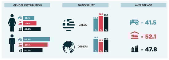 A closer look at the data reveals significant disparities based on gender and nationality. The male population constitutes an overwhelming majority, comprising 86.9% of individuals experiencing homelessness on the streets and 81.6% of those residing in temporary housing structures. In contrast, female individuals comprise 13.1% of street-dwellers and 17.4% of those in shelters. A notable exception to this pattern is observed in supported apartments, where the gender balance is almost equal, with 49.4% of residents identifying as female and 50.6% as male. In terms of nationality, the data show that Greek nationals constitute 56.4% of the street homeless population and approximately 74% of those in both housing structures and supported living programs. In contrast, foreign nationals comprise 24.6% of the street homeless population, exhibiting a reduced presence in formal housing programs [11,12,13].