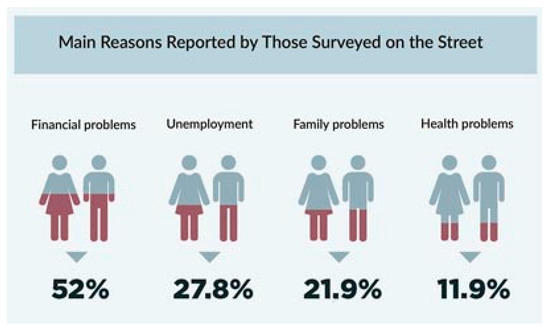 The main reasons reported by those surveyed on the street were 52% financial problems, 27.8% unemployment, 21.9% family problems, and 11.9% health problems [11,12,13].