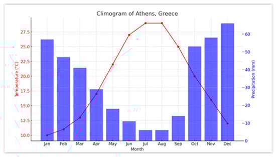 The climate of the Athens metropolitan area is classified as Mediterranean, with hot, dry summers and mild, wet winters. The region is marked by substantial seasonal temperature variability, with summer temperatures frequently surpassing 35 °C during heatwaves and winter temperatures seldom dipping below 10 °C [23]. The temperature peaks in July and August. Precipitation is highest in the winter months (November to January) and lowest in summer, especially July and August. A climogram of Athens follows based on long-term climate averages from the Hellenic National Meteorological Service [24].