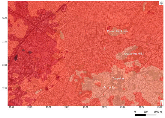 Notably, the urban heat island (UHI) effect is a salient feature of Athens’ climate, exacerbating the impacts of summer heat. The combination of rapid urbanization and the extensive use of impervious surfaces, such as concrete and asphalt, along with limited green space, contributes to the absorption and retention of heat within the city. Consequently, the city center and densely populated urban areas experience significantly higher temperatures compared to the surrounding mountainous zones [25].