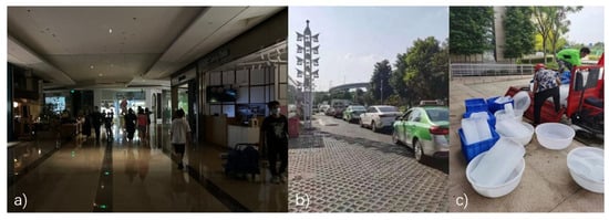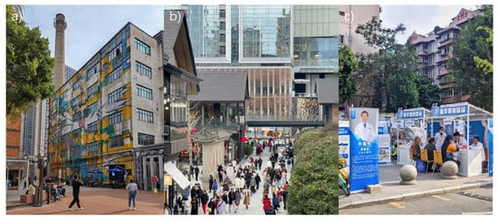(a) The hard surfaces and uneven distribution of green space in an old industrial area in transition; (b) a busy commercial street in Jinjiang District; (c) a healthcare service at the roadside in Qinyang District (Source: by author).