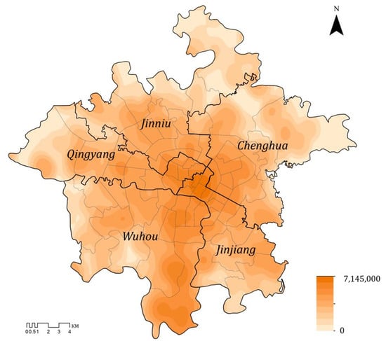 The Weibo posts obtained through web scraping needed to be screened to improve the data accuracy. Firstly, ArcGIS was used to remove the posts checked in outside of the five core urban areas of Chengdu. Following this, for post cleaning, a Python (ver 3.11) code was used to remove advertising posts, blank posts, and Weibo posts without text information; in addition, we removed content such as “@user”, “#talk hashtag#”, and “http: URL link” in the Weibo texts. Finally, 19,388 valid posts were retained, as shown in Figure 5. The yellow dots in the figure represent the geographical locations of the Weibo posts with check-in information. Figure 6 shows the spatial differences in the number of Weibo posts in different areas through kernel density analysis.