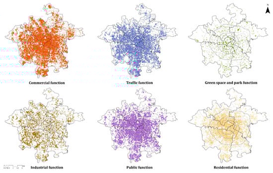 The urban functional category classification refers to the method of Wang et al. [] and Zhang [], and in accordance with the principle of universality and consistency of POI classification. The POI data were further categorized into six major categories: residential, public, commercial, industrial, green space and parks, and traffic, based on the reclassification above (Figure 7).