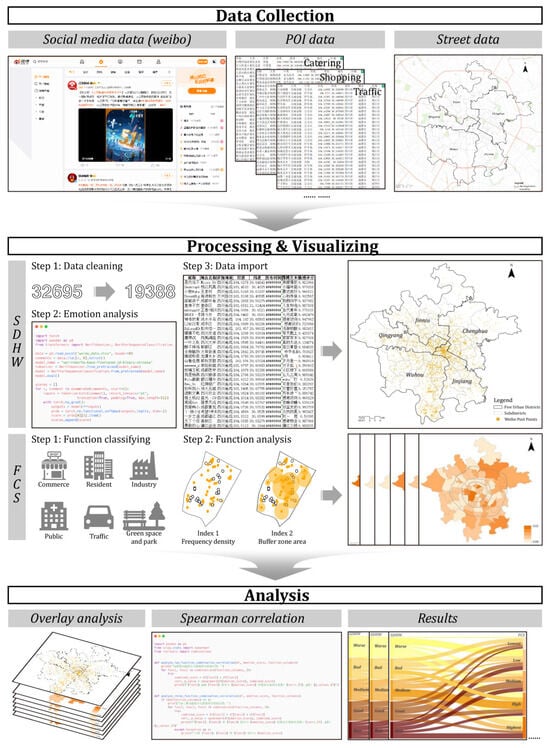The Spearman correlation coefficient was used to analyze whether the degree of correlation between the streets’ sentiment scores and the percentage of FCS was significant, and Sankey diagrams were used to show how the percentage of FCS affects the sentiment rating. A Sankey diagram is a graphical tool used to visualize processes, resource allocation, and inter-relationships, and its distinctive feature is that the line categories of different thicknesses represent flows, effectively showing the connections and interactions between multiple objects through changes in the shape and thickness of the connecting lines. Figure 8 shows the entire methodological framework of this study.