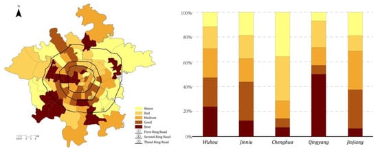 As shown in Figure 9 (left), during the heat waves, there were obvious spatial differences in the distribution of sentiment values of the residents in Chengdu City; in addition, the proportion of the five categories of the sentiment values of the streets in each district was also counted (Figure 9, right). Overall, for positive sentiment values (better and best categories), the streets within the Second Ring Road are larger than the streets outside of the Second Ring Road, and the streets in the western districts are larger than the streets in the eastern districts. The main western districts are Wuhou, Qingyang, and Jinniu. Of them, 57% of streets in the Qingyang District have positive sentiment values, and 47% of streets in the Wuhou District have positive sentiment values. Negative sentiment values (worse and worst categories), on the other hand, are dominated by the eastern districts, for example, 71% of the streets in the Chenghua District have negative sentiment values, with Shahe Street, Shishishan Street, and Chenglong Road Street all having negative sentiment values.