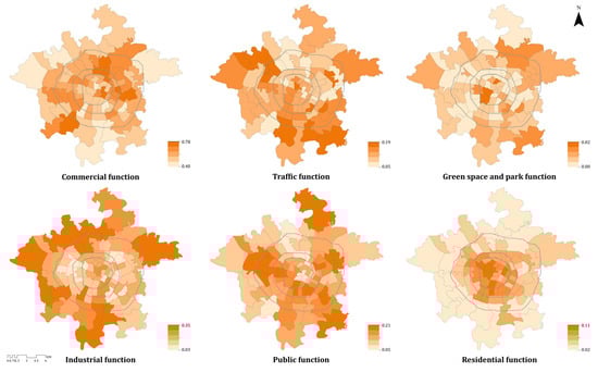 Based on the functional category division of the POI data, we obtained the share of the six functional categories of 77 streets (Figure 10). The spatial pattern of the six urban functional categories is clear, with the overall commercial function in the five core urban areas of Chengdu City accounting for a large proportion, and the overall proportion in the northeast and southwest being slightly higher. The industrial function shows a much higher distribution outside of the Third Ring Road than inside the Third Ring Road, while the pattern of the residential function is completely the opposite. The spatial pattern of green space and parks is relatively uniform, with both high and low values in each district. The traffic and public function show similar spatial patterns.