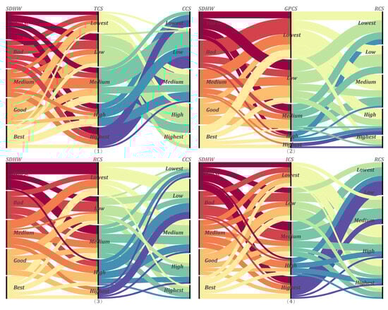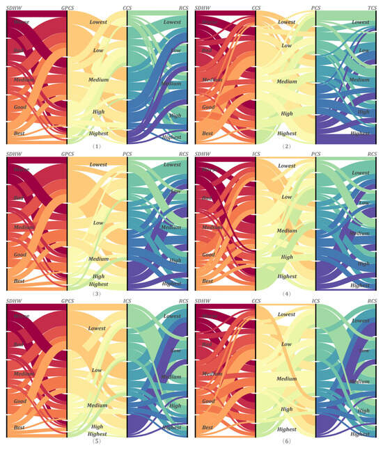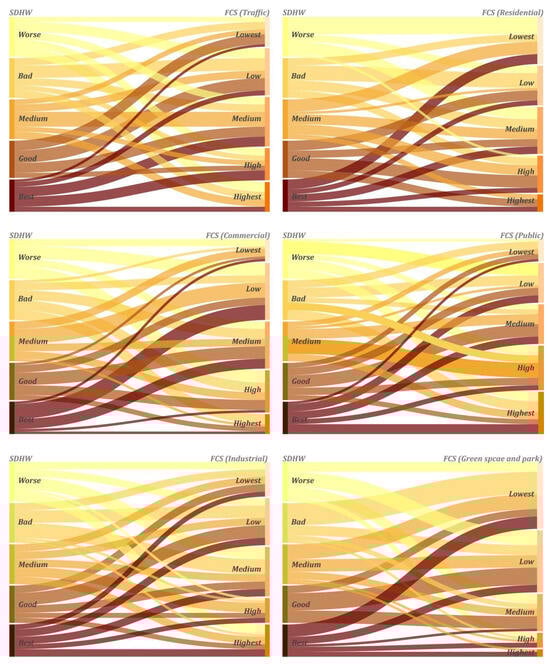 Figure 12 and Figure 13 show the mechanisms by which each combination of FCS in the significant association rule affects SDHW. Specifically, among the two combinations of FCSs, good SDHW is more likely to be found on streets with a lower proportion of the commercial category (CCS) and a higher proportion of the traffic category (TCS) (e.g., Figure 12-1, whose Sankey diagram shapes tend to be dominated by upward-bending curves). Residential streets with a high proportion of green spaces and parks (GPCS) (as in Figure 12-2, where the shape of the Sankey diagram tends to be a smooth, straight line) mainly show positive SDHW in streets with a high proportion of the residential category (RCS), and also tend to have positive SDHW in streets with a low proportion of the commercial function or a low proportion of the industrial category (ICS) (as in Figure 12-3,4, where the shape of the Sankey diagram tends to be an upward-bending curve). On the contrary, when the proportion of both the residential category and the green space and parks category is low, the street tends to produce poorer SDHW.