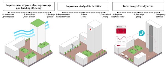 This section focuses on streets where residents are predominantly negative and where the category of public function is scarce, mainly including Longtan Street, Hehuachi Street, Shaheyuan Street, and so on. For these streets, the focus should be on upgrading the public facilities and public spaces in order to improve the adaptive capacity of street spaces during high-temperature heat waves. At the street level, these areas are most affected by the impact of heat wave events due to old facilities and the lack of services. In this regard, it is possible to improve medical service resources and extend the opening hours of public buildings to provide people with timely access to medical care and nearby places to avoid the heat and cool off, and, at the same time, increase the number of resting chairs, cool huts, and other public support facilities to create a cool space. In addition, taking into account the low-income characteristics of the region’s residents, in the event of a sudden heat wave, the residents can be guided to large sports stadiums, subway stations, and other public spaces to ‘centralized cooling’ []. This model can not only provide the residents with emergency places to avoid the heat, but also alleviate the pressure on the city’s power supply.