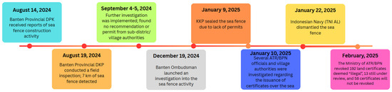Despite reaching national notice in early 2025, officials were aware of the sea fence’s existence some months previously. The Banten Provincial Marine and Fisheries Office (DKP) first received a report concerning the structure on 14 August 2024. Five days later, a field inspection revealed that the fence at that time extended approximately 7 kilometres. In early September 2024, DKP Banten, in coordination with the Civil Service Police Unit (Polsus) from the Ministry of Marine Affairs and Fisheries (KKP), conducted further site visits and discussions. Findings revealed that the construction lacked official recommendations or permits from local sub-district or village authorities. Shortly thereafter, the Ministry of KKP sealed off the structure, citing the absence of a Coastal and Small Islands Zoning Utilisation Permit (KKPRL) and its location within designated Capture Fisheries and Energy Management Zones.