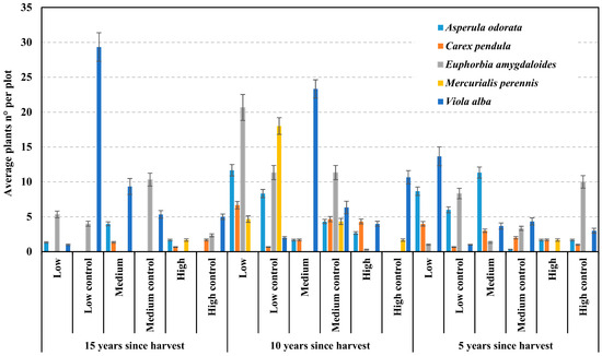 Statistical analyses were conducted to assess the regeneration of herbaceous species influenced by traffic intensity (low, medium, and high) and time since harvest, focusing on the five most abundant species among the twenty-five studied. For each compartment, comparisons were made between skid trails (categorized by traffic intensity) and their corresponding control plots (matched by traffic intensity level) (Table 5 and Figure 2).