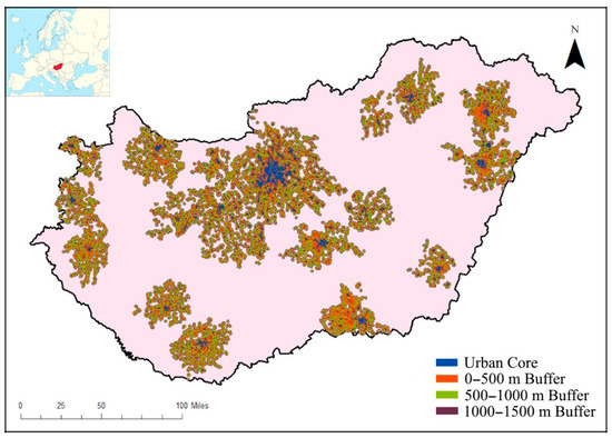 Study area comprising the urban cores and fringes (divided into near (0–500 m), medium (500–1000 m), and far (1000–1500 m) buffer zones) of Hungarian cities (Urban Atlas 2018).