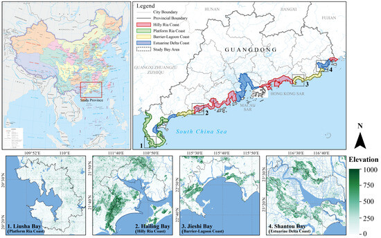 Based on existing research, typical bay samples were selected for geographic representativeness and analytical control. The selection criteria are listed in Table 1. The final comparative study samples include Hailing Bay (hilly ria), Liusha Bay (platform ria), Jieshi Bay (barrier-lagoon), and Shantou Bay (estuarine delta).