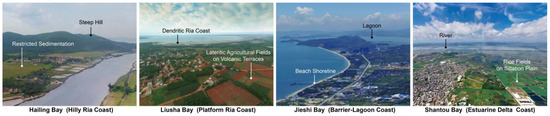 Bay-unit selection criteria were implemented following China’s national coastal survey protocols (1980–1985) [48], delineating a 10 km inland buffer from the shoreline. Representative bays from each geomorphic type were analyzed (Figure 1 and Figure 2), with core characteristics defined as follows: