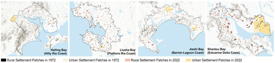 Figure 3. Identified settlement patches across four representative bay units, derived from multi-temporal remote sensing analysis (1972 vs. 2022). - Topographic and Hydrologic Data: Digital elevation models (30 m resolution) and national hydrographic vector datasets were acquired from the Geospatial Data Cloud (http://www.gscloud.cn/) (accessed on 15 September 2024).