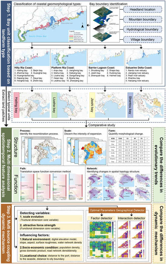 To address these gaps, this study aims to answer the core question: How do diverse coastal geomorphologies differentially drive the spatiotemporal dynamics of rural settlements? This study innovates in the following three key areas: (1) Theoretical framework: It develops an integrative framework combining multi-bay units, spatiotemporal analysis, and dynamic mechanisms, classifying coastal zone systems by geomorphology and analyzing their spatial adaptation patterns. (2) Research unit: It replaces administrative boundaries with bay units, restoring the integrity of coastal settlement systems. (3) Methodological breakthrough: This study employs the geographical detector method, which offers higher sensitivity to spatial heterogeneity than traditional methods, to identify multi-source coupling driving effects of natural environments, socio-economic factors, and location.