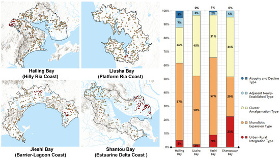 Hailing Bay (Hilly Ria Coast) exhibited a distribution pattern of 5:57:26:7:5, dominated by Monolithic Expansion. Mountainous terrain constrained growth to ribbon-like patterns along the coast, with wide spacing limiting settlement coalescence. This bay recorded the highest proportions of Atrophy and Adjacent Newly Established types, reflecting a “high-altitude abandonment → low-altitude nucleation” trend that highlights topographic constraints on long-term sustainability.