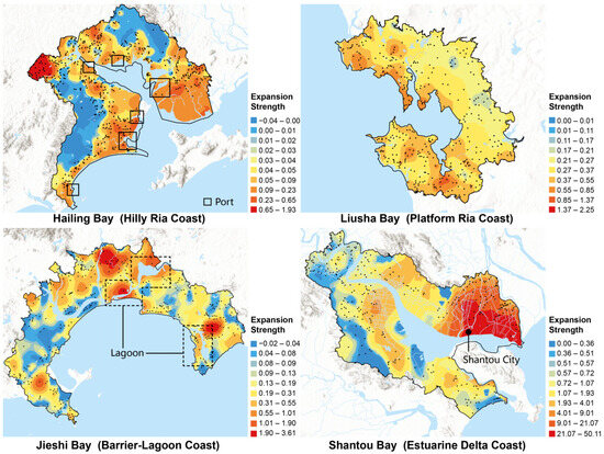 Significant differences in expansion intensity and spatial patterns were observed across the four bay units (Figure 6 and Figure 7).