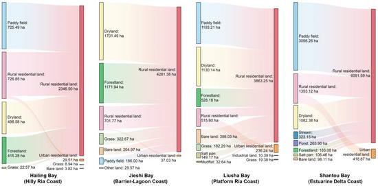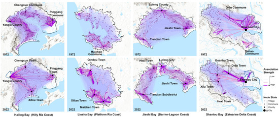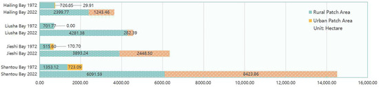 Shantou Bay (Estuarine Delta Coast) demonstrated the highest expansion intensity with an annual growth rate of 248.78 ha/yr. In 1972 and 2022, its settlement area consistently exceeded other bay units, expanding radially outward from Shantou City in a monocentric pattern driven by rapid urbanization.