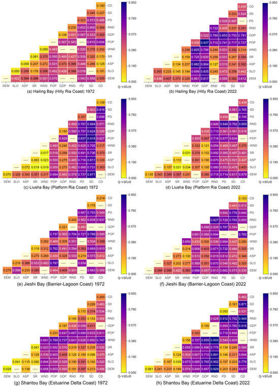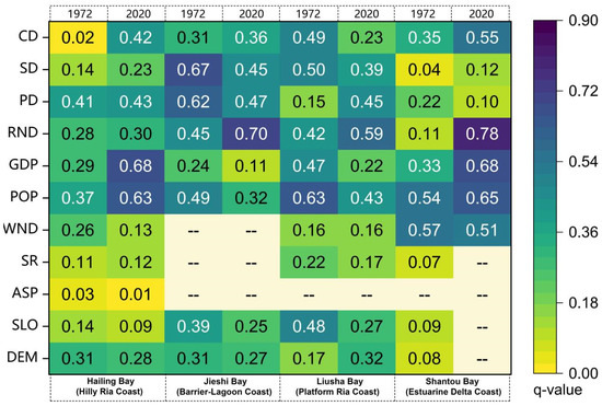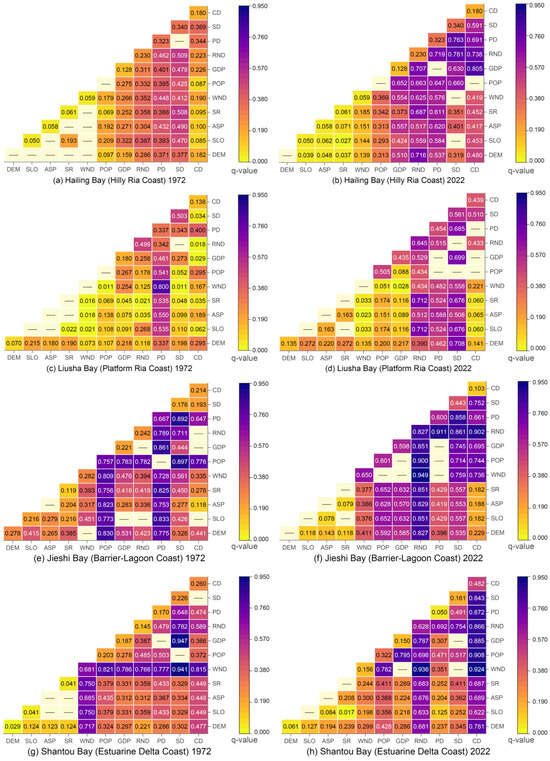 - Heterogeneous Response Principle. Research has shown that identical socio-economic factors produce different effects in various geographical environments. For example, beach coasts, with their loose sandy structures, are more easily altered under tourism pressure, leading to significant geomorphic changes [60], while bedrock coasts experience minimal disturbance [61]. While the role of geomorphic environments in spatiotemporal evolution is well-established [43], further investigation is needed into how multiple geomorphic types lead to differentiation.