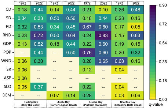 Building on CHANS Theory, this study develops an analytical framework for the spatiotemporal evolution of coastal rural settlements. It centers on “multi-type bay units—multidimensional spatiotemporal characteristics—multisource coupling driving mechanisms” (Figure 4). The framework classifies bay units based on geomorphology, following the scale dependency principle, and establishes a baseline for coupling natural and social processes. By integrating multidimensional features, the framework quantifies structural–functional co-evolution, addressing the limitations of one-dimensional analysis. The optimal parameter geographical detector model identifies the interactions of multiple driving forces—natural environments, socio-economic factors, and location—capturing the heterogeneity in these mechanisms [62,63]. The bay unit classification addresses “where coupling occurs,” spatiotemporal features quantify “how coupling is measured,” and driving mechanisms explain “why coupling happens.” This framework shifts the focus from static spatial patterns to interpreting human–environment coupling mechanisms, filling the gap in comparative studies of dynamic rural settlement systems across different geomorphic types.