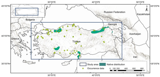 Species occurrence data were obtained from open access resources and the relevant literature. The data were thinned at a scale of 5 km to avoid spatial autocorrelation and to evaluate at the same resolution as the bioclimatic variables. In the next phase, a total of 402 occurrence records were used [52,56,57,58]. The area of study encompasses the border region of Türkiye. The current distribution of U. glabra in Türkiye is marked by diverse geographical regions and is extensively dispersed along the eastern shore of the Black Sea, reaching westward from the Georgian border (Figure 1).