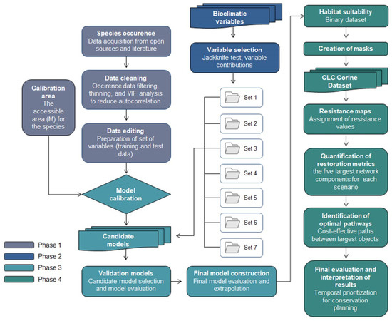This study is based on the MaxEnt models implemented in Ar et al. [8] (please see Ar et al. [8] for further details). The previous study had done modeling, but the presented study applied RP on it and identified key restoration areas with optimal pathways (corridors). The MaxEnt model was chosen because it is well-suited for presence-only data and is widely regarded as a robust tool for predicting species distributions under current and future climate scenarios. The Restoration Planner (RP) tool was selected because it enables systematic identification of priority restoration areas and supports the evaluation of landscape connectivity and cost-effective conservation strategies. The methodology follows four main phases to determine optimal restoration pathways that support the long-term sustainability of the target species, using its projected distribution under different climate scenarios (Figure 2). The first phase of the study involves modeling the potential distribution of the species based on occurrence records (GBIF, Copenhagen, Denmark) and environmental data. This includes data cleaning (filtering, thinning, and VIF analysis), data editing (preparation of training and test datasets), and the definition of the calibration area (accessible area, M). Phase 2 focuses on the selection of bioclimatic variables through jackknife tests and analysis of variable contributions across seven variable sets. Phase 3 includes model calibration, the development of candidate models, their selection and evaluation, and the construction of the final model through extrapolation. Phase 4 addresses landscape connectivity by generating resistance maps derived from land cover (Corine land cover-CLC, Copernicus Land Monitoring Service, Copenhagen, Denmark) and infrastructure data, which are combined with the binary habitat suitability map. These are used to compute restoration metrics based on the five largest network components and to identify cost-effective optimal pathways. The results are then interpreted spatially and temporally to prioritize areas for conservation under future climate scenarios (SSPs).