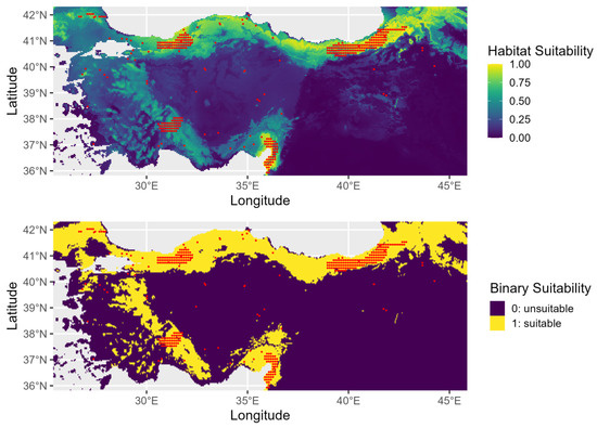 Present-day habitat suitability for Ulmus glabra in Türkiye. The top panel shows continuous suitability and the bottom panel a binary classification of suitable (yellow) and unsuitable (purple) areas.