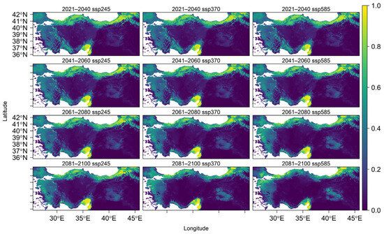 The AUC value of the training set shown in Figure A2 indicates that the model does have greater predictive power in comparison to random prediction. The jackknife test results of the selected variables in the model are given in Figure A3. SDM performed better against the areas with the highest potential for species’ present-day distributions (Figure 3). When compared to the distributions in previous periods, there is more clustering along the Black Sea coast, especially in northern Türkiye. Habitat suitability declines progressively as the species extends from this region toward inland southern areas.