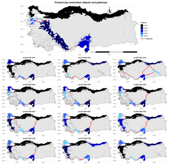 The restoration scenarios for U. glabra were assessed using the RP of GuidosToolbox [80]. The RP is a spatially explicit protocol that has been developed to simulate improvements in fragmented ecological networks by virtually inserting restoration areas and quantifying the resulting gains in network connectivity. In this framework, functional habitat networks are represented by discrete elements—patches of potentially suitable habitat identified through species distribution modeling. For each of the thirteen future scenarios, we employed the “Show Optimum Big 5” feature of RP, which automatically computes the most efficient pairwise pathways between the five largest disconnected network components. The algorithm calculates pixel-level least-cost paths based on resistance values, without predefined corridor widths, and incorporates the effect of intermediate “stepping-stone” patches to maximize connectivity gain. It is important to understand that, although they are called “pathways”, these pathways are one-pixel-wide least-cost paths, based on calculated resistance, not formal ecological corridors (which are wider, managed areas). The RP-based paths demonstrate optimal routes based on resistance values, without pre-defined buffers or official designation. So here, the term “pathways” is employed to denote the functional restoration corridors that are characterized by their cost-effectiveness. The term “objects” refers core habitat patches for restoration planning. Recommendations for detailed examples can be found in the RP product sheet (Vogt 2024) [80].