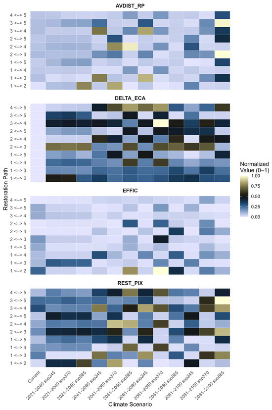 Heat maps representing the normalized values (ranging from 0 to 1) of four metrics used for restoration planning under different climatic scenarios: Restoration Pixels (REST_PIX), Average Distance of Restoration Pixels from the Network (AVDIST_RP), Change in Equivalent Connected Area (DELTA_ECA), and Restoration Efficiency (EFFIC).