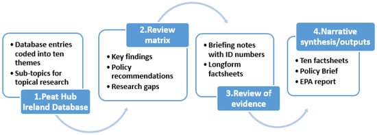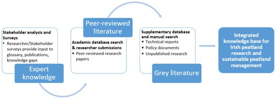 Systematic evidence synthesis covers a broad spectrum of approaches and methods that are used to be more systematic in the way evidence is synthesised and combined from multiple sources [13]. The heterogeneous nature of the current research on Irish peatlands, which involves multiple disciplines, sectors, and methodologies, necessitates a more comprehensive approach than that used in traditional systematic reviews that aim to answer specific, focused questions. Such reviews can be biased toward quantitative data, and their positivist approach to evidence synthesis may exclude important knowledge inputs from the social sciences, practitioners, and stakeholders [13]. This study embraces a broader knowledge synthesis framework, one that incorporates expert and stakeholder knowledge with the peer-reviewed and grey literature to represent the wide knowledge base needed for sustainable peatland management (Figure 1). This approach is informed by recognition of multiple forms of knowledge as legitimate and necessary for sustainability transitions, which is in line with recommendations from global assessments [14] and calls for broader definitions of evidence that incorporate knowledge beyond the peer-reviewed, academic literature [15].